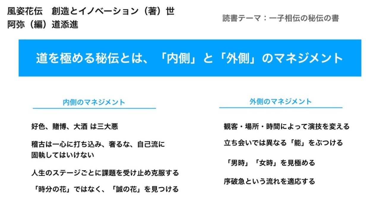 1日1冊 一子相伝の秘伝の書 風姿花伝 創造とイノベーション コンテンポラリー クラシックス 著 世阿弥 編 道添進 小倉 研太 プロマネ X フルリモート Note